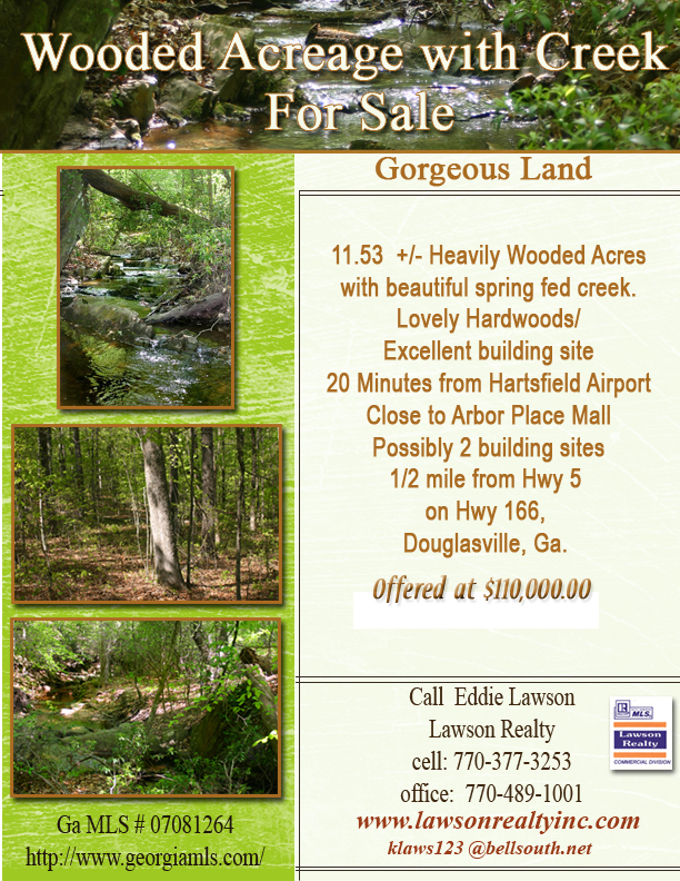 Beautiful hardwoods, approx. 200 ft +/- Road Frontage Approx 25 min from Atlanta Airport